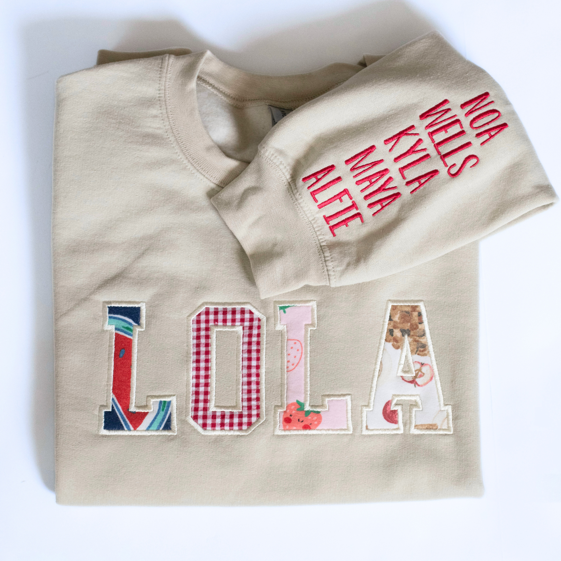 Custom keepsake sweatshirt words include (but are not limited to): GIGI, GRAMMY, PAPA, DAD, MIMI, NANA, TATA, ABUELA. Message me for custom order requests!