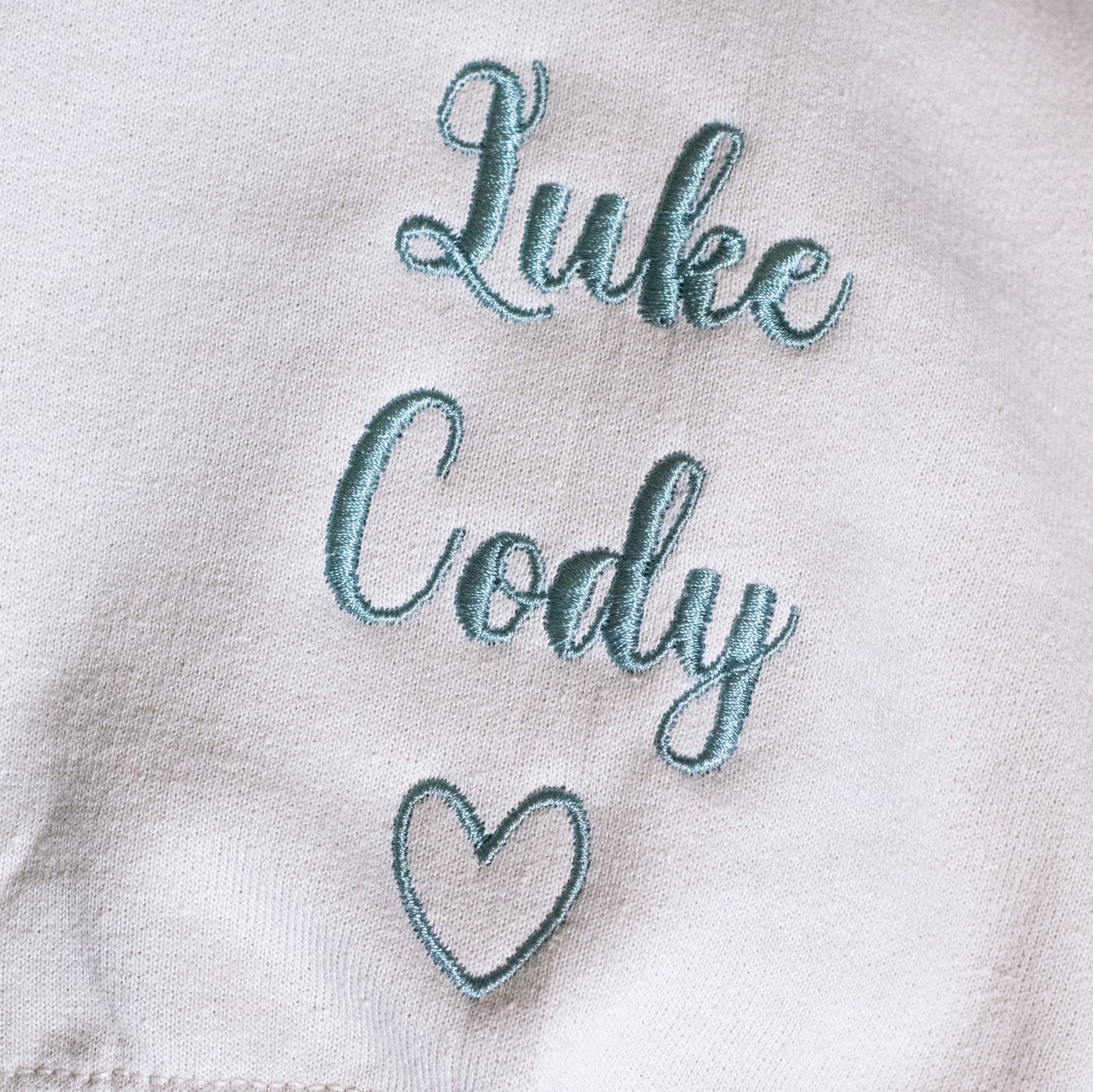This custom keepsake sweater can also be embroidered with optional names, heart designs, applique letters and angel wings on the sleeves (additional cost).