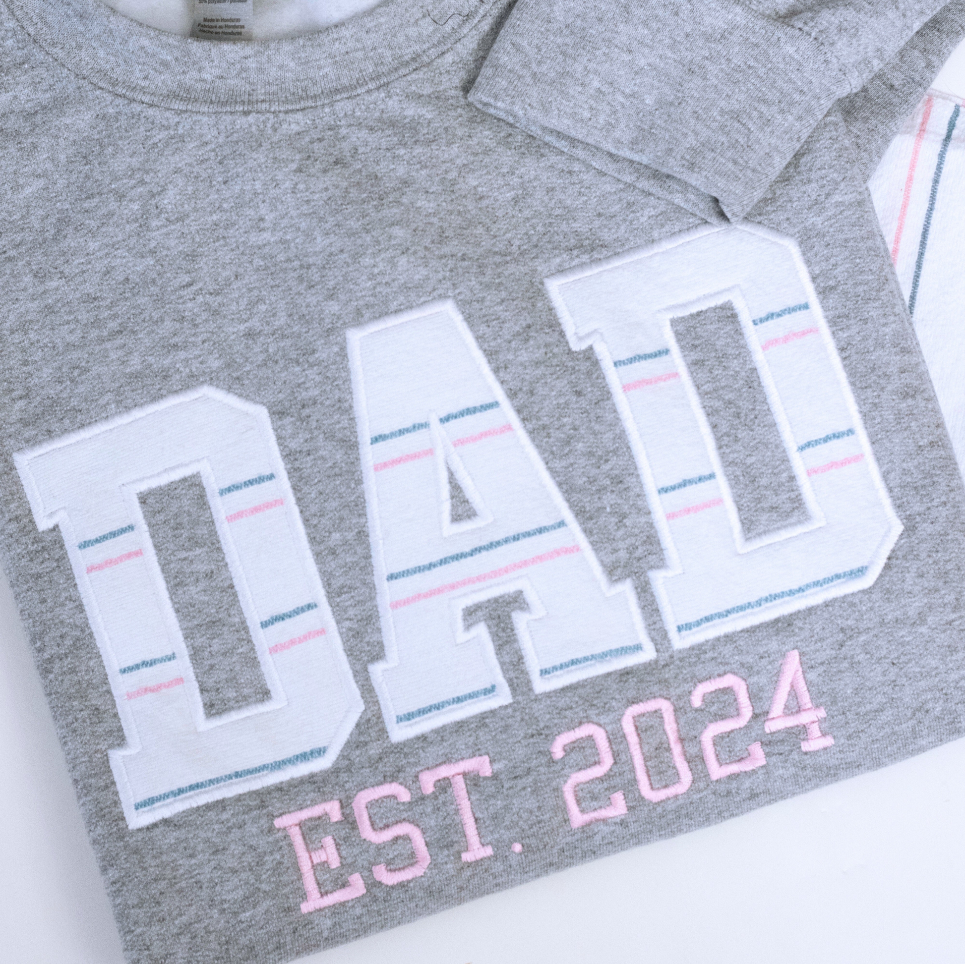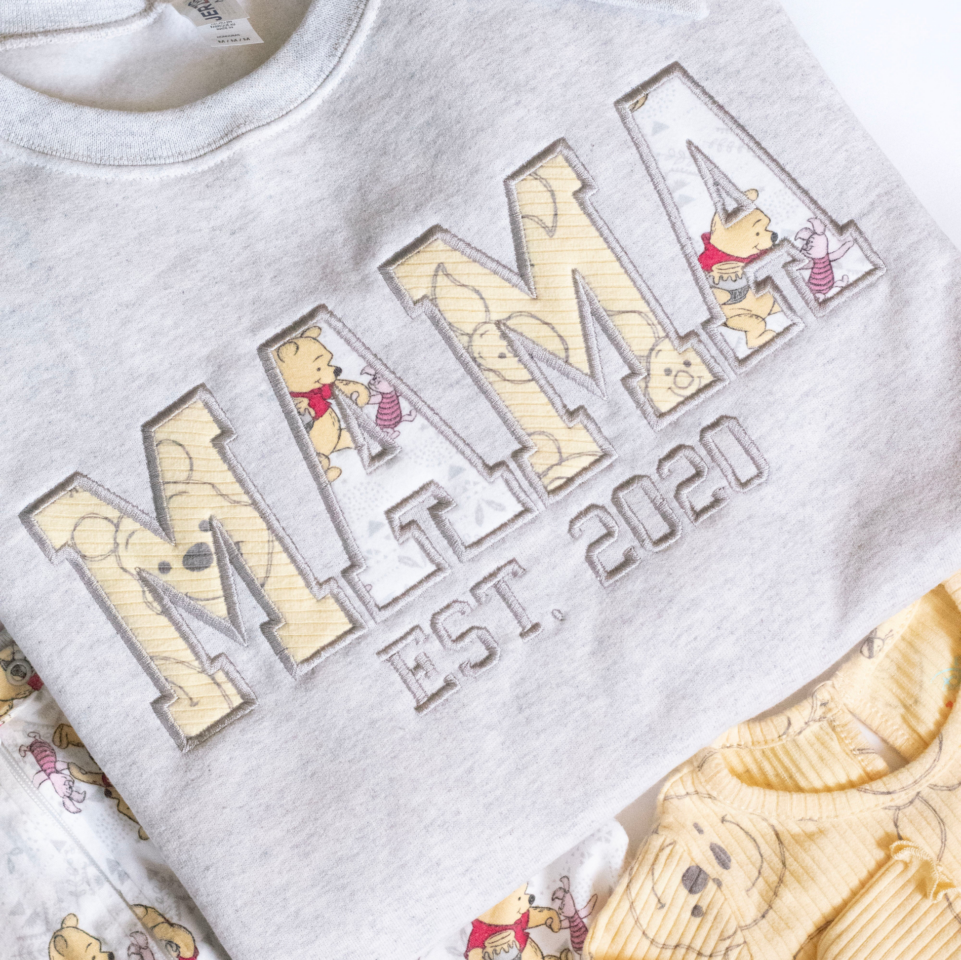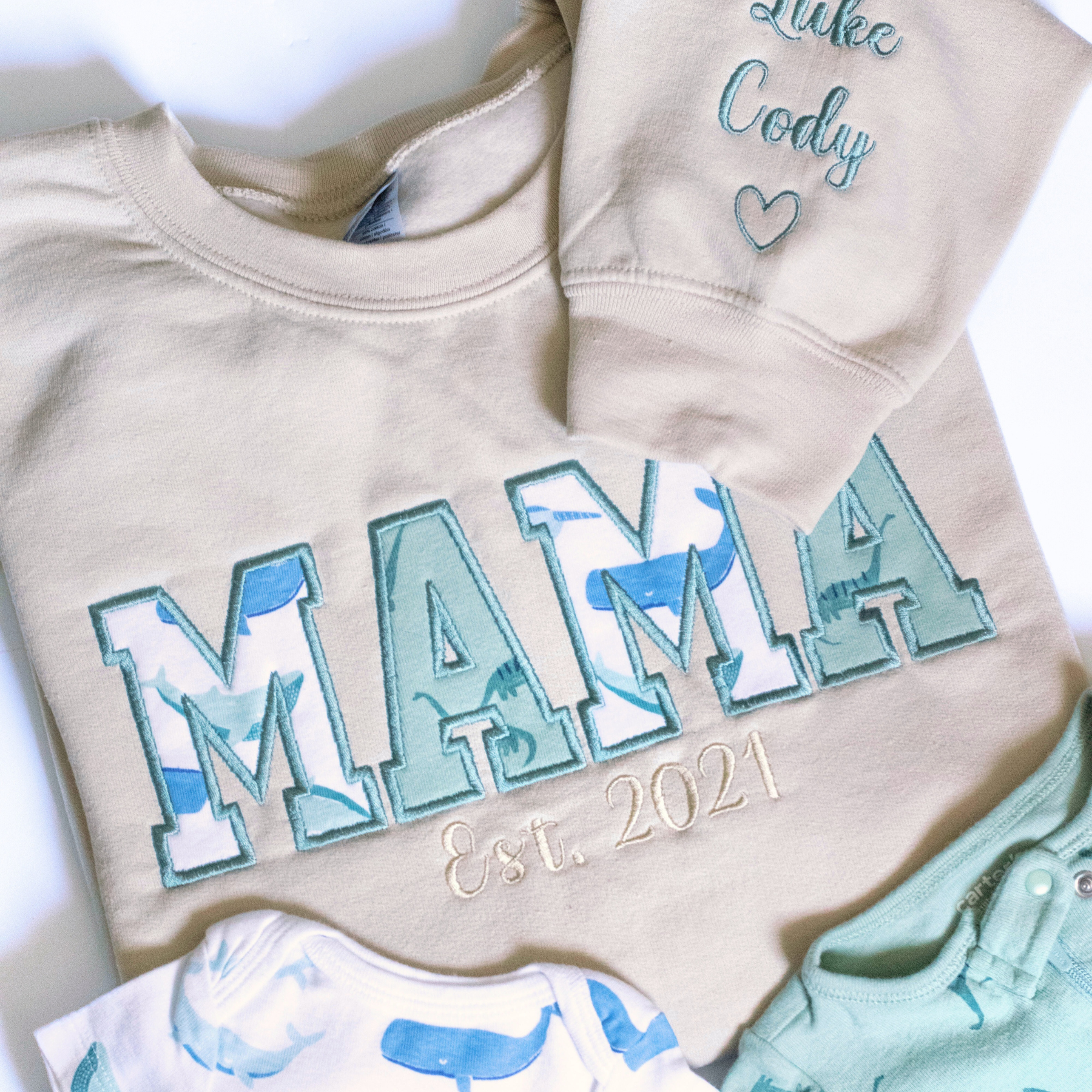 A meaningful gift idea for mothers who cherish and want to preserve their little ones first baby outfits, this MAMA sweatshirt is custom embroidered using baby clothes, featuring custom appliqué embroidery to create a unique keepsake MAMA sweatshirt! Underneath the word MAMA is the word "Est." and the year of your choice. Made-to-order with a professional embroidery machine, the word "MAMA" and "Est. [Year]" is embroidered across the chest of a soft cotton-poly blend pullover sweater, with high quality embroidery thread in a beautiful satin stitch! This custom embroidered sweatshirt is of the greatest quality you can expect from my small business!