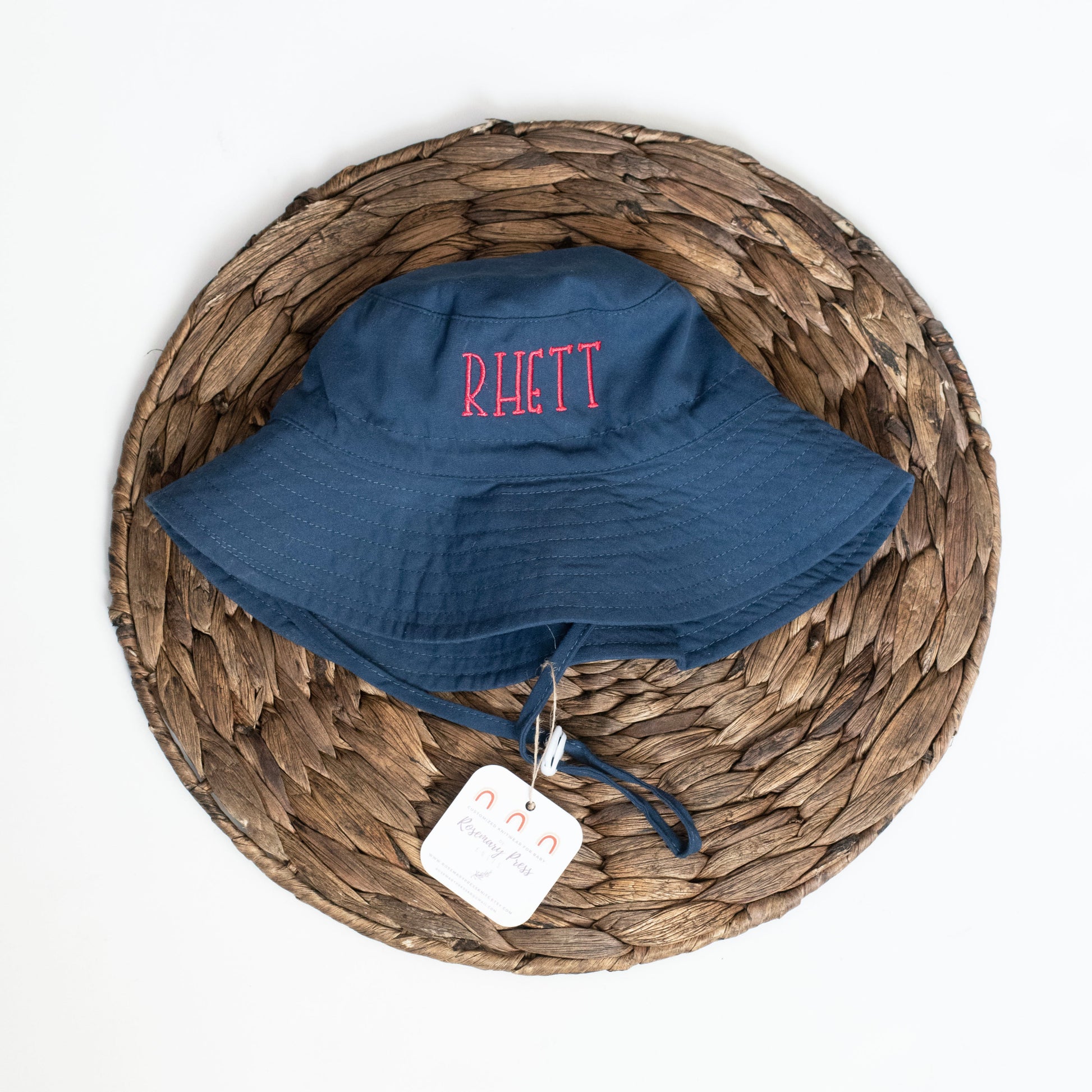 Navy bucket hats for baby or toddler with custom embroidered names! Get your little one ready for their first camping adventures and for sun-filled summer days at the beach! A super cute and adjustable sun hat for baby or toddler, personalized with their first name! Custom baby bucket hats are available in your choice of army green or cargo and baby name is custom embroidered using a sturdy, high-quality thread. The personalized detail of the hat makes it extra special! These customized bucket hats make a stand-out and practical gift that parents love!