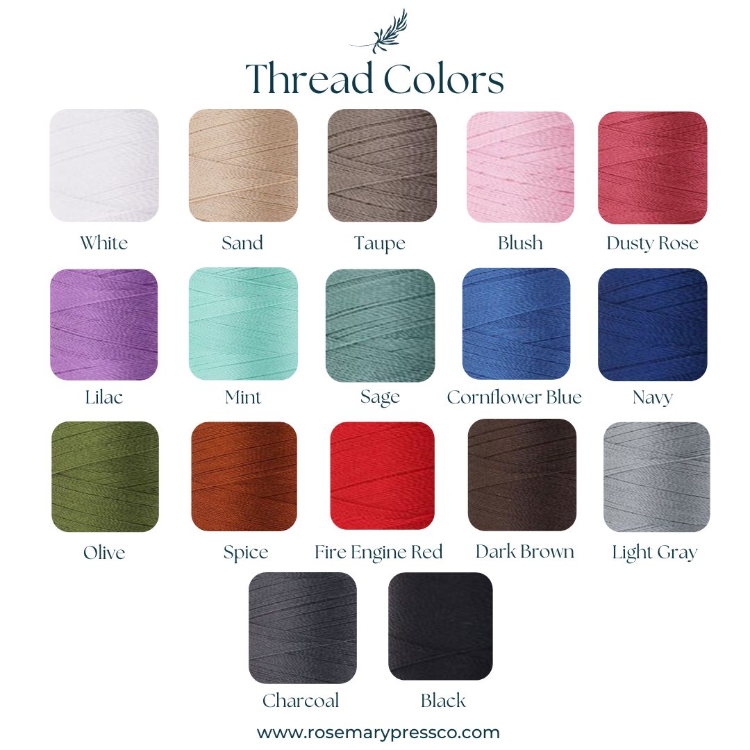 Use the Swatch Lists shown in product photos to choose font/thread color.